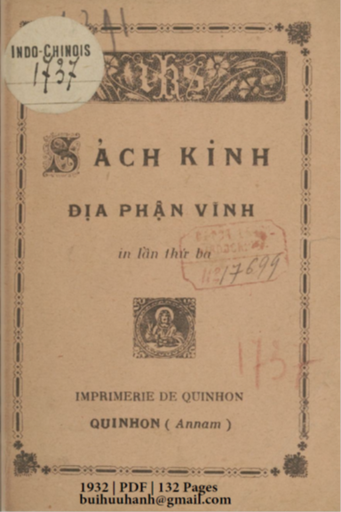 Cuốn "Sách Kinh Địa Phận Vĩnh" được Nhà xuất bản Qui Nhơn ấn hành vào năm 1932, là một tập hợp các kinh nguyện và hướng dẫn thực hành đạo Công giáo dành cho địa phận Vĩnh (nay là Giáo phận Vinh). Với 132 trang, cuốn sách này không chỉ là một tài liệu tôn giáo mà còn là một phần lịch sử quan trọng, phản ánh đời sống đức tin và cách thức thực hành đạo của cộng đồng Công giáo tại Việt Nam vào đầu thế kỷ 20. "Sách Kinh Địa Phận Vĩnh" là một tài liệu phong phú, cung cấp một cái nhìn toàn diện về các kinh nguyện, nghi thức và lòng đạo đức của Giáo hội Công giáo tại Việt Nam vào thời điểm xuất bản. Cuốn sách là nguồn tài liệu quý giá cho những ai muốn tìm hiểu về lịch sử tôn giáo, văn hóa và đời sống tinh thần của người Công giáo Việt Nam. Sách Kinh Địa Phận Vĩnh NXB Qui Nhơn 1932 Nhiều Tác Giả 132 Trang File PDF-SCAN Link download https://drive.google.com/file/d/165eCqVYdP0SLgWv7gkN5aFzm3zvVM3Fhhttps://drive.google.com/drive/folders/1yLBzZ1rSQoNjmWeJTZ3WGQHg04L1