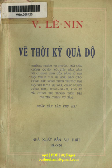 Cuốn "Về Thời Kỳ Quá Độ" (NXB Sự Thật 1958) của V.I. Lê-nin, tập hợp các tài liệu viết sau Cách mạng tháng Mười và trong thời kỳ nội chiến, phân tích thời kỳ quá độ từ chủ nghĩa tư bản lên chủ nghĩa xã hội. Sách nhấn mạnh nhiệm vụ tổ chức kinh tế, kiểm kê, kiểm soát, nâng cao năng suất lao động, và giáo dục văn hóa. Lê-nin giải thích sự cần thiết của chuyên chính vô sản, đấu tranh chống giai cấp tư sản và tiểu tư sản, đồng thời trình bày chính sách đối với nông dân và vai trò của Đảng Cộng sản trong xây dựng xã hội mới. Phụ lục của Dương Hiến-trân nêu bật ý nghĩa học thuyết của Lê-nin đối với Trung Quốc. Về Thời Kỳ Quá Độ NXB Sự Thật 1958 V. I. Lênin, 187 Trang File PDF-SCAN Link download https://drive.google.com/file/d/1ia8bcnsHp7t_uxxGvuGfBU1AhtE2Yjqxhttps://drive.google.com/drive/folders/1yLBzZ1rSQoNjmWeJTZ3WGQHg04L1